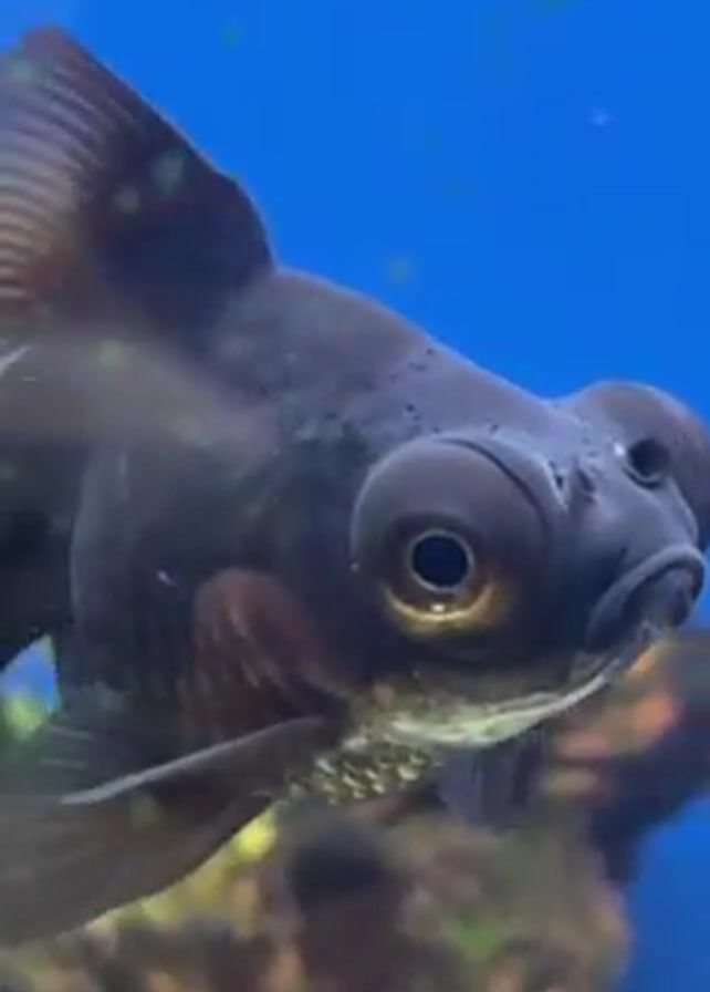 A close-up video shows a black Moor goldfish swimming in an aquarium