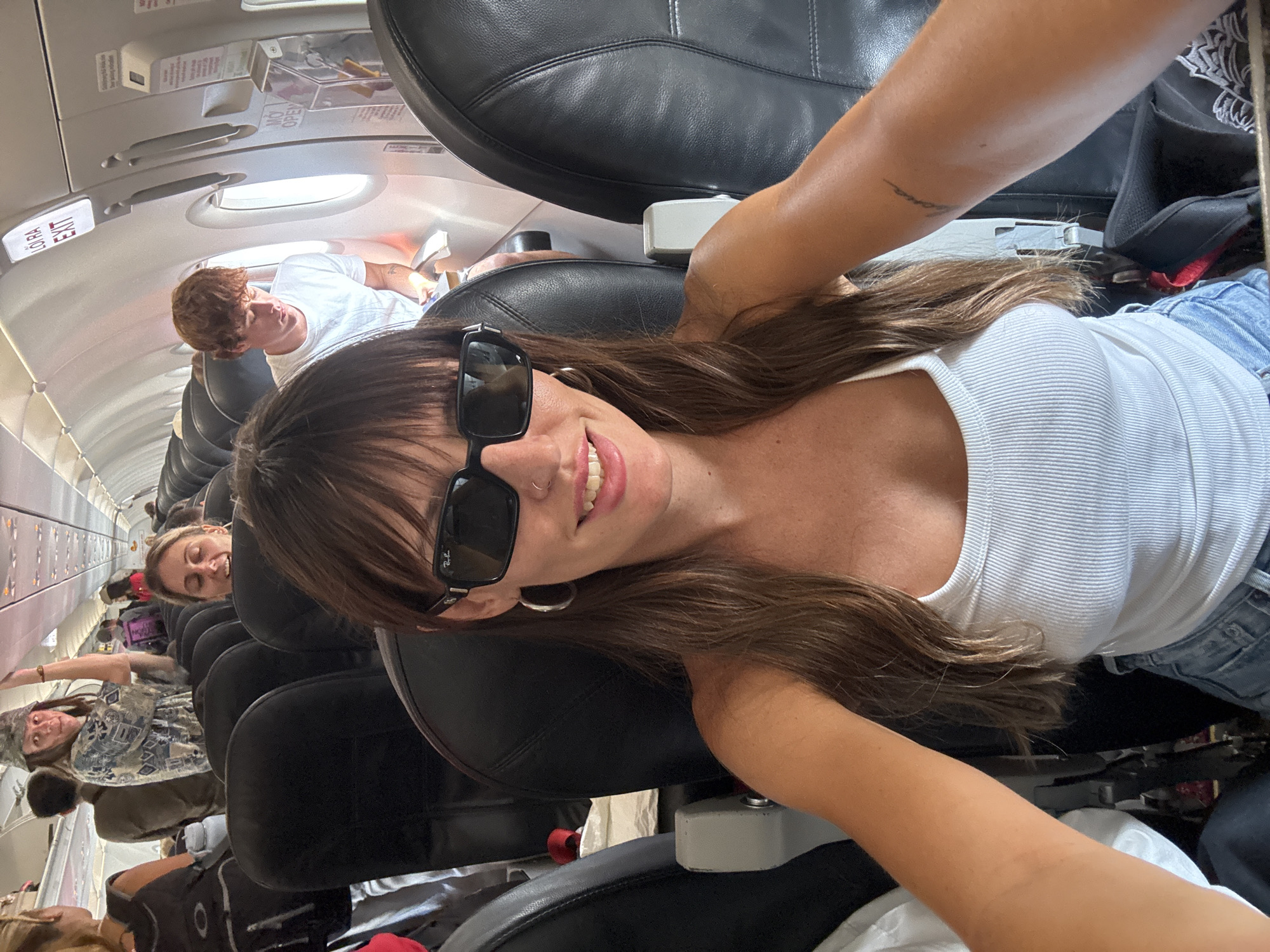 The image depicts the interior of a commercial aircraft cabin. There are no visual identifiers within the image itself to confirm the specific location as Kuta, Indonesia, or any other city. In the foreground, a female subject is seated in a black airline seat, facing forward and taking a selfie. She has long brown hair with bangs, wears dark rectangular sunglasses with "Ray-Ban" visible on the left temple, a silver nose ring, and silver hoop earrings. She is smiling broadly, revealing teeth, and wears a white ribbed tank top and light blue denim shorts. A small, dark script tattoo is visible on her left forearm. In the background, on the left side of the aisle, a woman wearing a patterned bucket hat and a blue-and-white patterned shirt is standing, with her left arm raised towards an overhead compartment. Behind her, a person wearing a black backpack is partially visible. Further down the aisle, other passengers are standing or seated. On the right side of the frame, behind the main subject, a man with reddish-brown hair, wearing a white t-shirt, is seated next to an aircraft window, looking down at an object in his hands. An illuminated "LÕIRA EXIT" sign is visible above the window. Another female passenger is partially visible behind the main subject, appearing to smile. The environment consists of rows of black airline seats, light-colored interior cabin walls, closed overhead bins, and aircraft windows. Natural light is visible from the windows. The scene suggests a period of active passenger movement, likely during boarding or disembarking.
