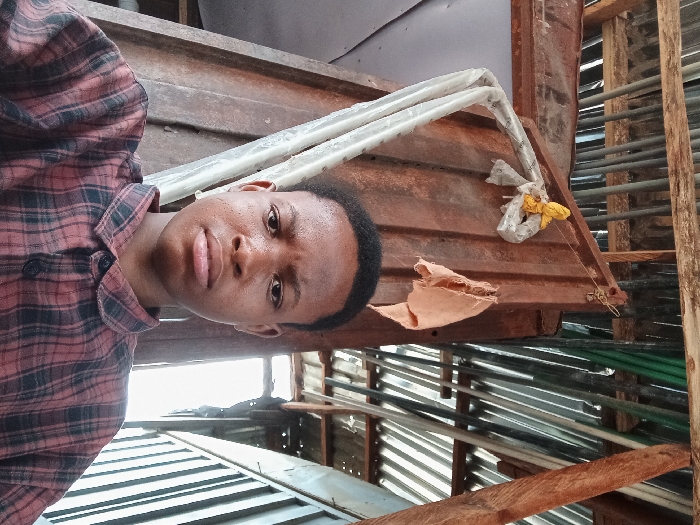 A close-up photograph depicts a young male subject with a medium-to-dark skin tone, short dark hair, and a neutral facial expression, lips slightly parted, looking directly at the camera. The subject is dressed in a red and black plaid collared shirt. The background consists primarily of a section of a rusted, reddish-brown corrugated metal panel. To the upper left of the subject, a section of white plastic tubing is loosely draped or secured, and a small yellow fabric bundle is secured with a white plastic tie. To the upper right, a light brown fabric scrap hangs. An overhead structure of wooden beams and corrugated metal sheets, appearing silver, green, and rusty brown, forms the ceiling. The environment appears to be a basic, potentially makeshift or utilitarian structure. This scene is located in the city of Unknown, Unknown.