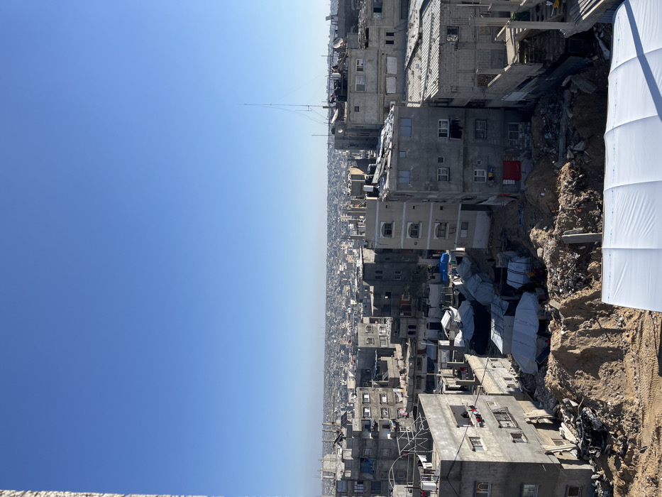 This elevated wide shot captures a densely populated urban landscape under a clear blue sky in Khan Yunis, Palestinian Territory