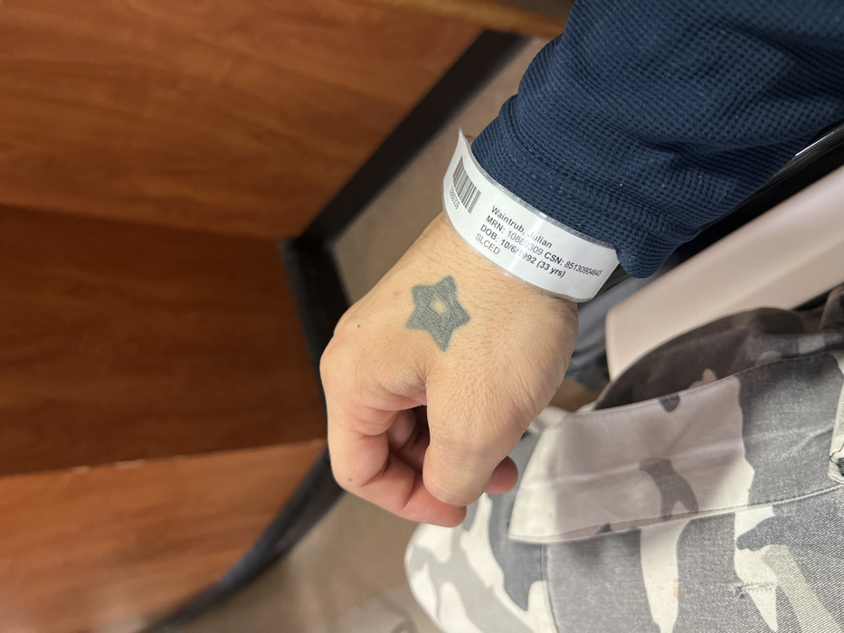 The image provides a close-up, first-person perspective of an individual's left hand and forearm, situated in what appears to be a medical facility or waiting room in the City of Newburgh, United States of America. The left hand displays a faded, dark grey, five-pointed star-shaped tattoo with a lighter, irregular central outline on its dorsal surface. A white patient identification bracelet is visible on the left wrist, featuring a barcode and printed text including "Wainrub, Julian," "DOB: 10/06/1992 (33 yrs)," "MRN: 1086-309," "CSN: 85309040," and "SLICED." The individual is attired in gray camouflage patterned pants and a dark blue waffle-knit long-sleeved shirt. The background consists of a wall finished with reddish-brown vertical wood paneling and a dark, possibly black, baseboard.