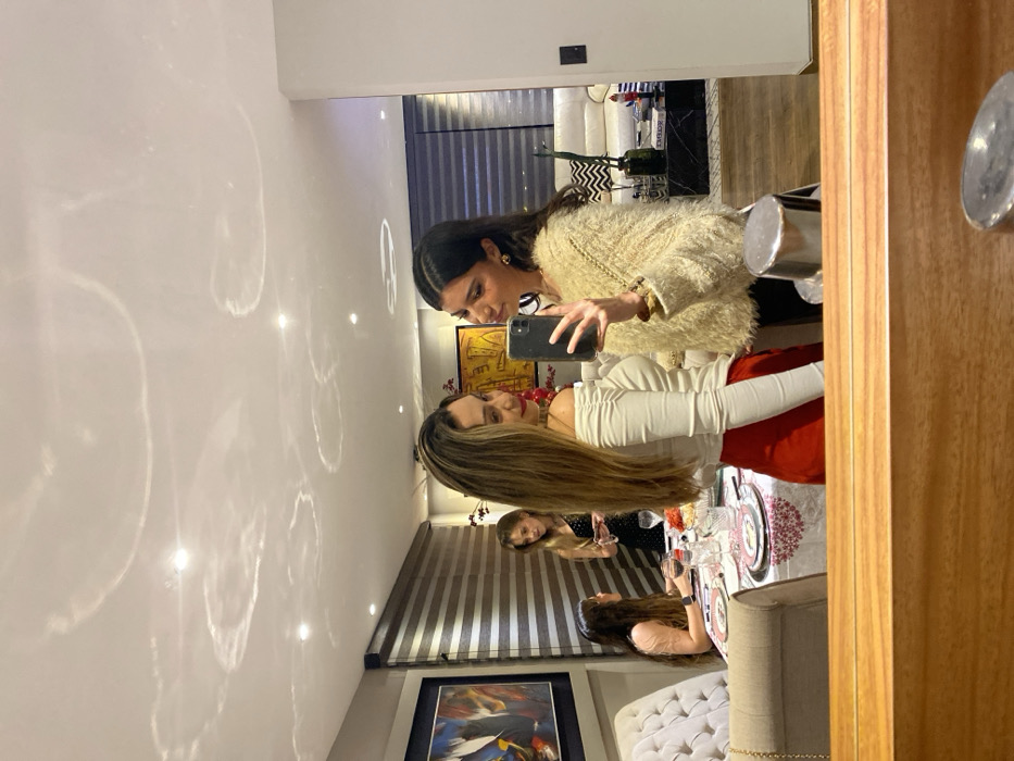 Two women take a selfie in a mirror. One wears a fluffy beige jacket, while the other wears a white top and red pants. A table is set for a meal, with glasses and a patterned tablecloth visible. Two other women sit at the table. Artwork hangs on the wall, and a striped wall decorates the room. A glimpse of a living area with a white couch and decorative items is visible in the background.