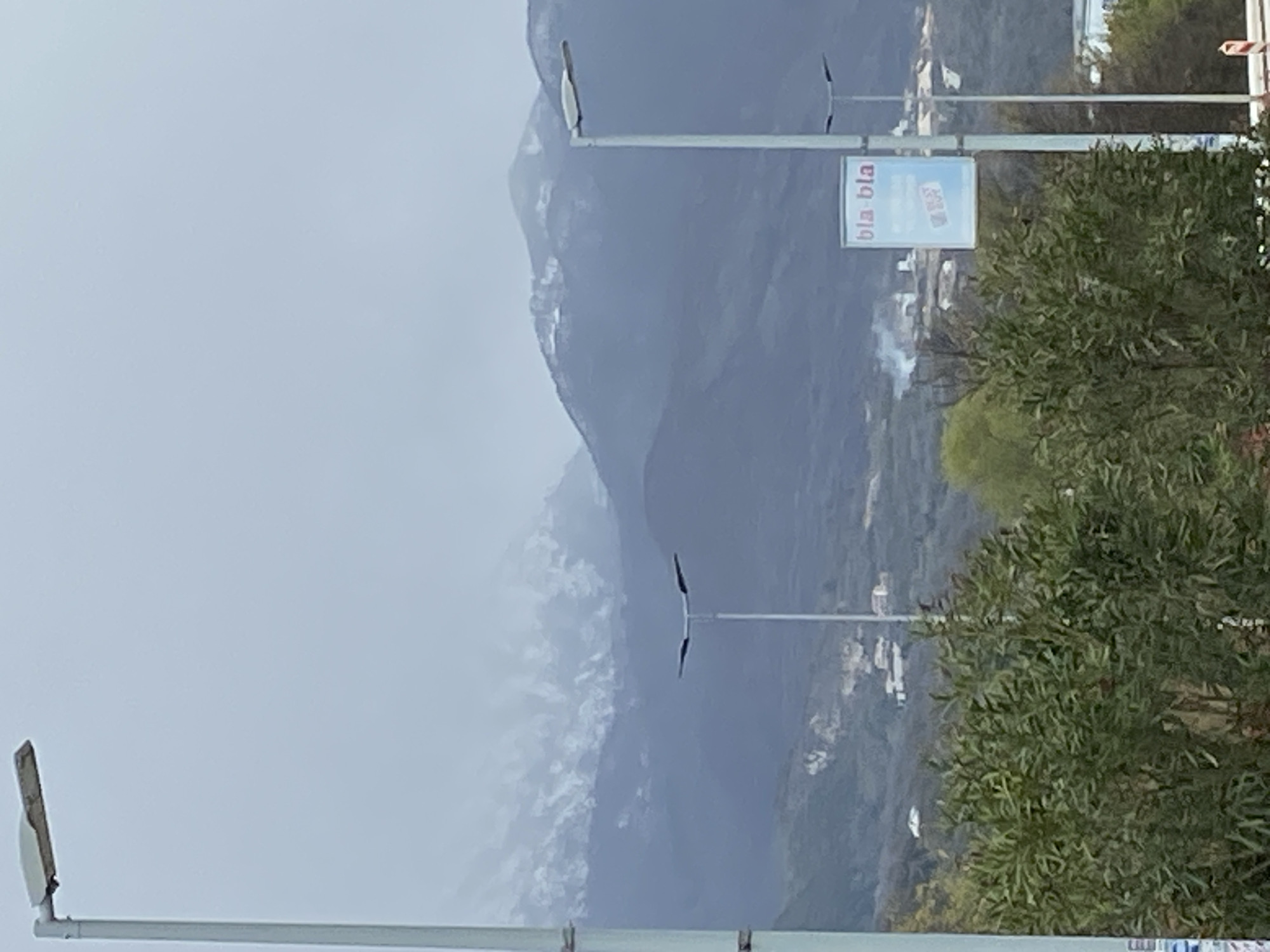 The image presents an outdoor scene overlooking the city of Dub, Montenegro, under an overcast sky. In the foreground, on the left, a tall, light gray streetlamp pole with a single, horizontal, rectangular LED luminaire is visible. On the right, another light gray streetlamp pole features a T-shaped arm supporting two linear luminaires and a rectangular billboard. The billboard displays "bla bla" in black letters at the top and "BEST BUY" in red letters below, against a white and light blue background. Green, leafy bushes occupy the lower portion of the frame, partially obscuring the view. The midground reveals a valley or lower hillside with scattered white and light-colored buildings, indicating a settlement. A distinct plume of white smoke rises from behind some structures in the central midground. The background is dominated by dark blue-gray mountains, whose upper slopes and peaks are covered with visible patches of snow. The sky above is uniformly light gray, blending into the distant, snow-capped mountain ranges. No individuals or active interactions are discernible.