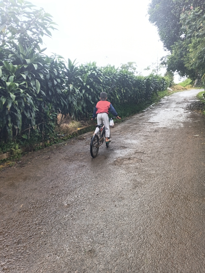 A child in a red jacket and light pants rides a bicycle on a wet road. Lush, dark green vegetation lines the left side of the road, contrasting with the lighter sky. The road curves slightly uphill, with more greenery visible on the right. The surface of the road is glistening, suggesting recent or ongoing rain. The child is seen from behind, pedaling away from the viewer.