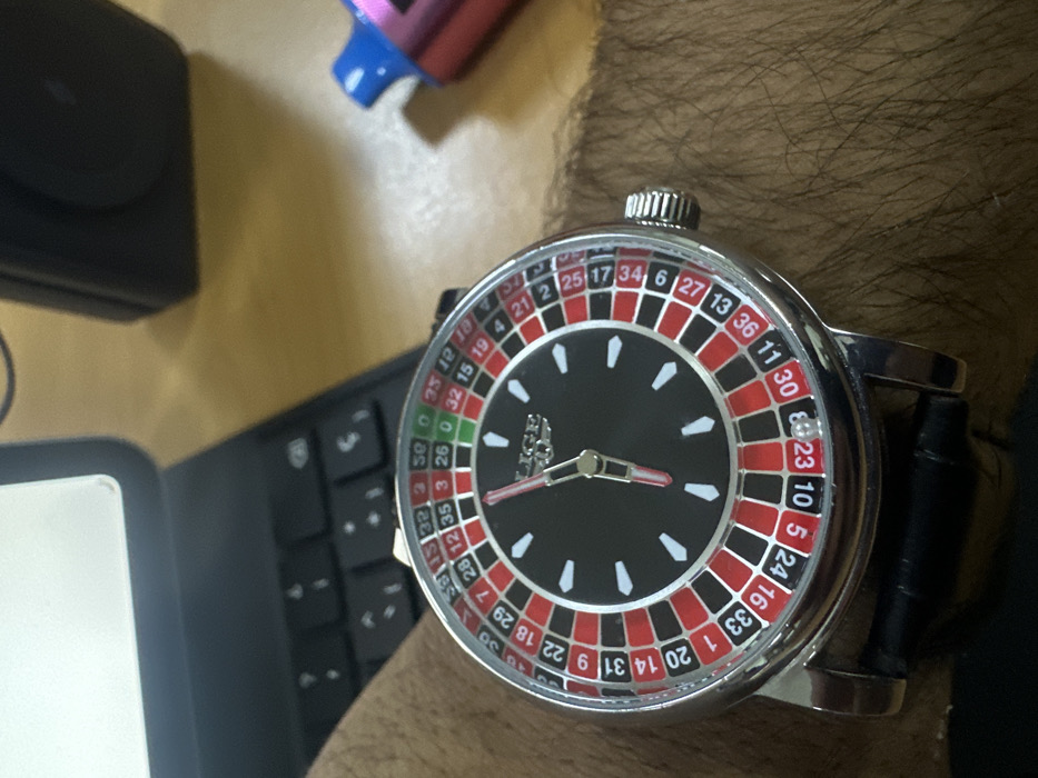 A silver watch with a unique roulette-themed face is the main focus. The face features a black dial and outer ring with the numbers and colors of a roulette wheel. The hands of the watch are red and silver. The watch rests on a hairy arm. Adjacent to the arm and watch are a black computer keyboard, a black rectangle, and another object with blue and pink hues. The background is a light brown surface.