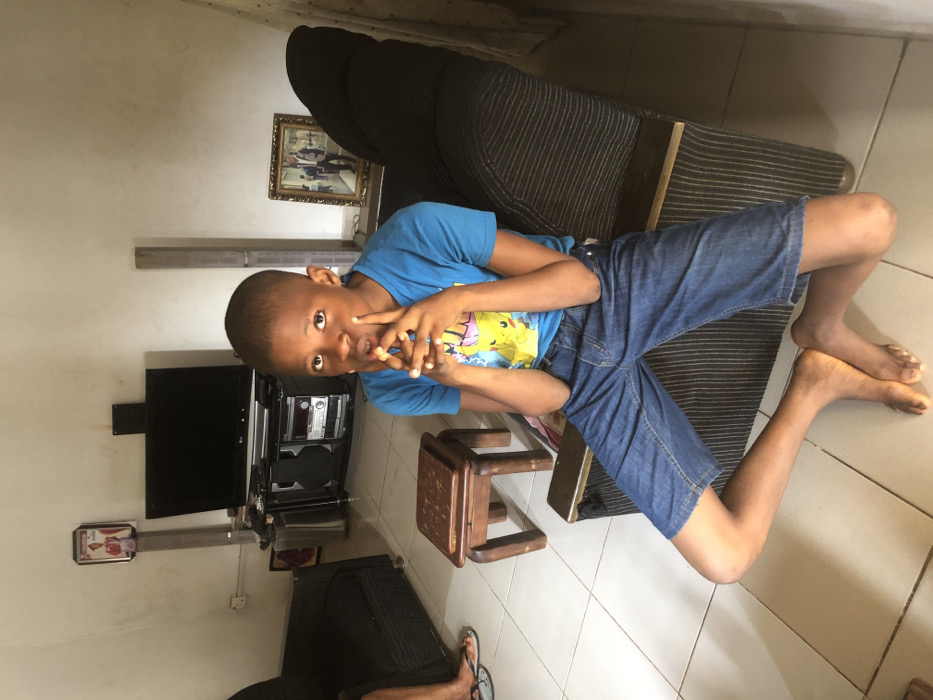 An indoor scene in Orie Uratta, Nigeria, depicts a young male seated on a dark, striped two-seater sofa