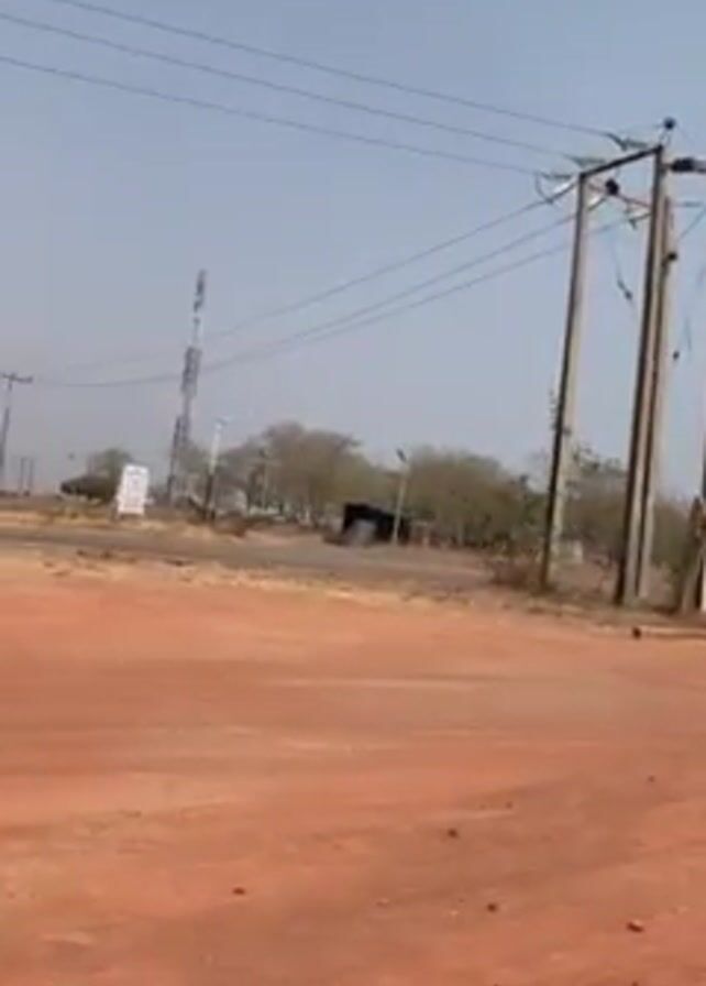 dirt road with red soil. There are power lines and poles on the right. In the background, there's a communication tower, trees, and what seems to be a small building. The sky is clear and a light blue. There are no people visible in the video. The camera slowly pans from right to left.