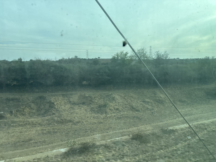 The image depicts an outdoor, undeveloped landscape in Ghumanda, India, viewed through a green-tinted medium, likely a window, exhibiting multiple surface imperfections and smudges