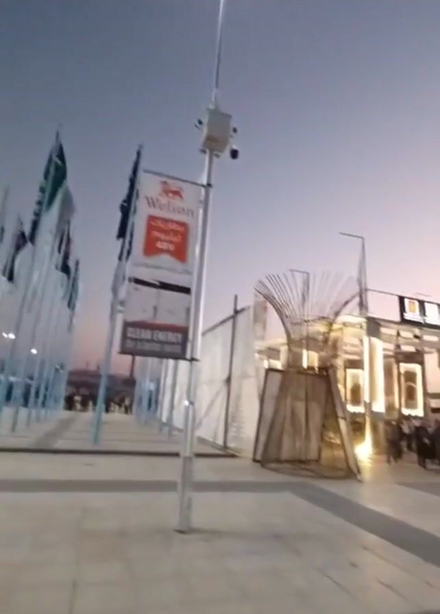 n outdoor plaza area at dusk. There are many flags on poles on the left side of the frame. A sign for "Welion" is attached to a light post, which also has a security camera. There is some sort of decorative metal structure that looks like an unfinished sculpture. A group of people walks in the distance. A man walks toward the camera, carrying what looks like a tablet. A crane with a large object suspended from the hook is visible on the right side of the frame. The area appears to be in preparation for some sort of event.