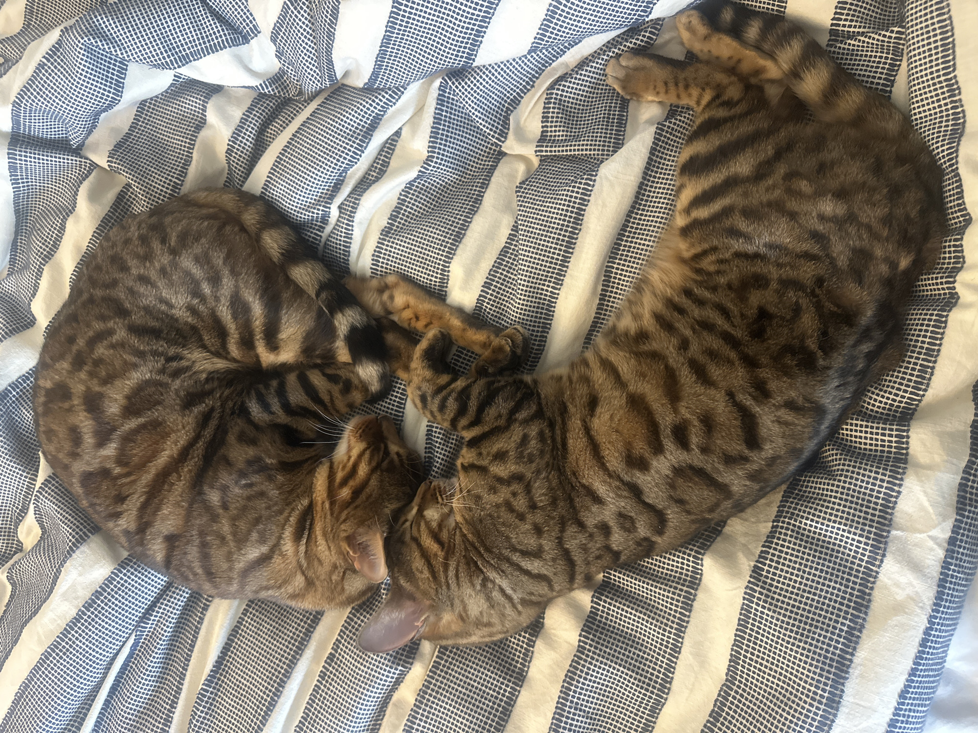 The image displays two felines, both exhibiting brown and black spotted/marbled coats characteristic of a Bengal breed, resting on a bed within a residence in Waverley, United Kingdom. The bedding consists of a white fabric patterned with alternating horizontal stripes, featuring solid white bands and blue bands with a fine white grid texture. The upper feline is curled into a tight C-shape, with its head tucked and eyes closed, positioned slightly above and to the left of the lower feline. The lower feline is stretched in an elongated, curved posture, also with closed eyes, with its head resting near the midsection of the upper animal. Both felines are still, indicating a state of sleep or deep rest, with their bodies in contact.