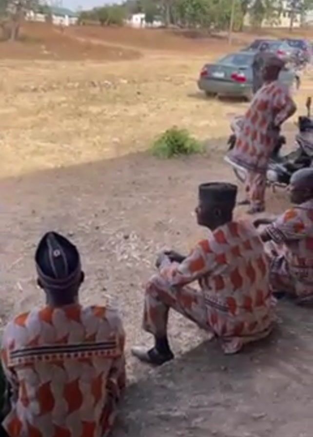 Several individuals, some wearing matching patterned outfits and caps, are gathered outside a building on what appears to be a sunny day. Some are sitting on the ground while others stand. Cars and a motorcycle are visible in the background, parked in a lot. The environment seems to be a dry, grassy area with a few scattered trees and buildings in the distance. There are some interactions and conversations happening within the group, but the exact nature of these interactions is unclear.
