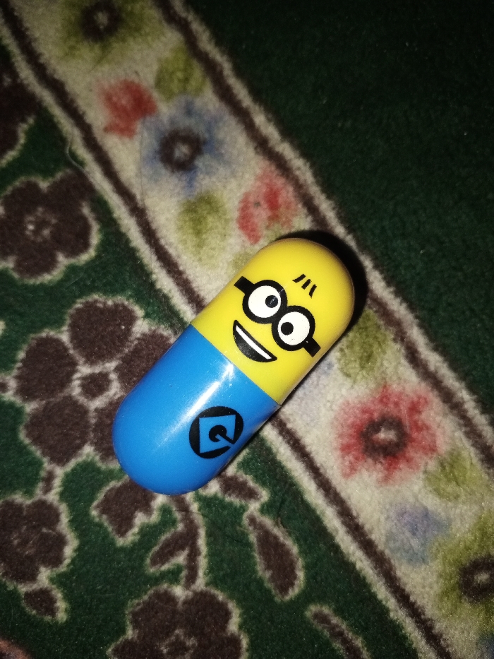 - "A Minion-themed container shaped like a capsule, with a yellow top and blue bottom, rests on a patterned rug" by FM-pltcW2, licensed under CC BY 4.0