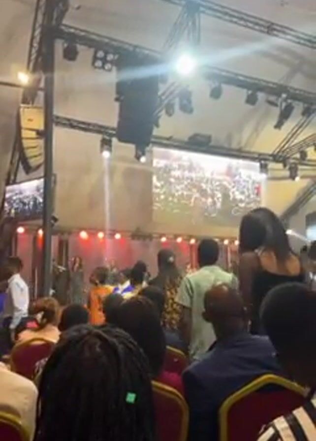 church service in progress. A group of singers and musicians are performing on a stage, which is visible over the heads of the seated congregation. A large screen above the stage displays a close-up of the stage performance. The room is large, with exposed metal beams and rigging supporting lights and speakers. People in the audience are dressed in a variety of clothes. Some are seated and some are standing. The video is shot from the perspective of someone seated in the audience.
