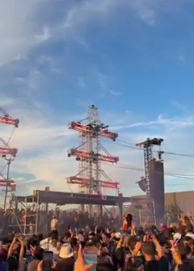 large crowd of people gathered at an outdoor music festival. The crowd is dense, with many people holding up their phones to record the performance. A large metal stage structure towers over the crowd, equipped with lights and speakers. The sky is blue with some wispy clouds, suggesting it may be daytime or early evening. The overall atmosphere is energetic and lively.