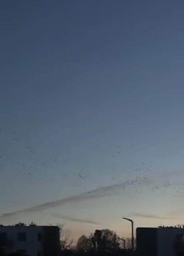 A wide-angle shot reveals a large flock of birds flying against a blue sky with wispy clouds. The buildings and trees are silhouetted in the foreground against the dusk sky. A group of people are visible in the lower left corner, their faces obscured. A street light is visible next to a parked car in the lower right corner. The flock of birds is the dominant feature in the sky.