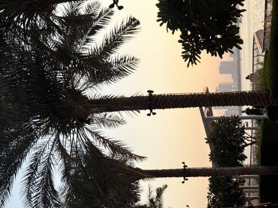 An upward view showcases several palm trees against a sunset-hued sky. Dark fronds dominate the foreground, obscuring the light. The tree trunks are equipped with dark fixtures. The scene transitions to a lighter area with buildings visible in the distance. People are discernible near a waterfront area with structures. The right side of the frame features green bushes and a building.