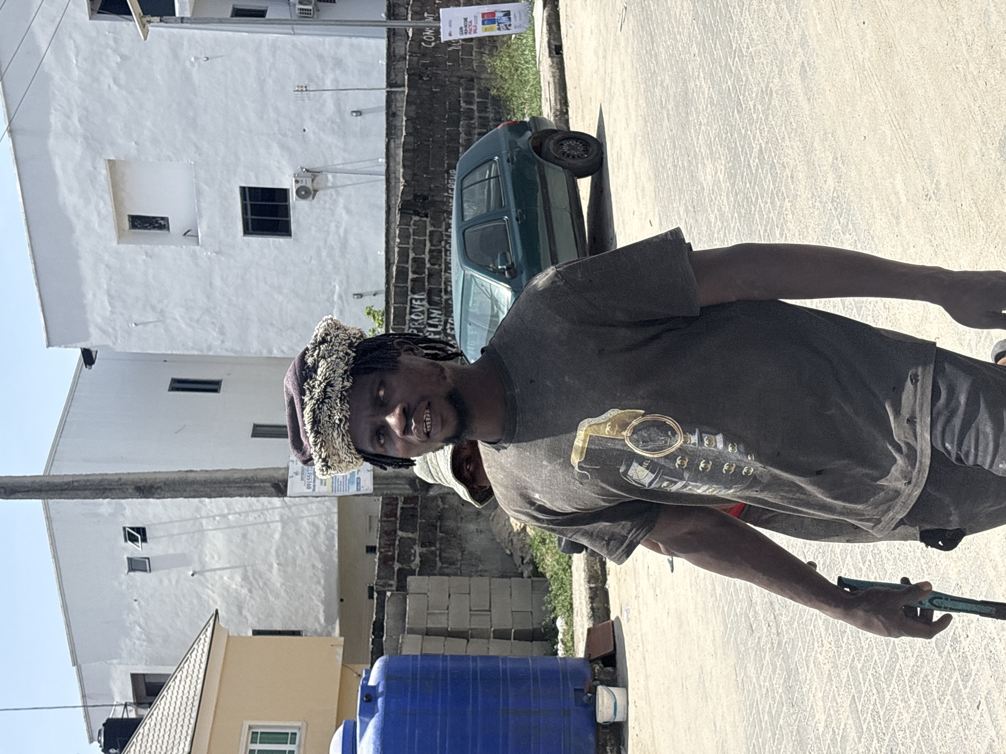 A man with dark skin and dreadlocks, wearing a cap and a dirty t-shirt, is seen from the chest up in Igboefon, Nigeria. He is holding a tool, possibly working or about to work on something. In the background, there is a light green car parked along the street, a pile of grey bricks, a large blue water tank, a multi-story white building with visible windows, and a utility pole. The scene suggests an urban residential area.