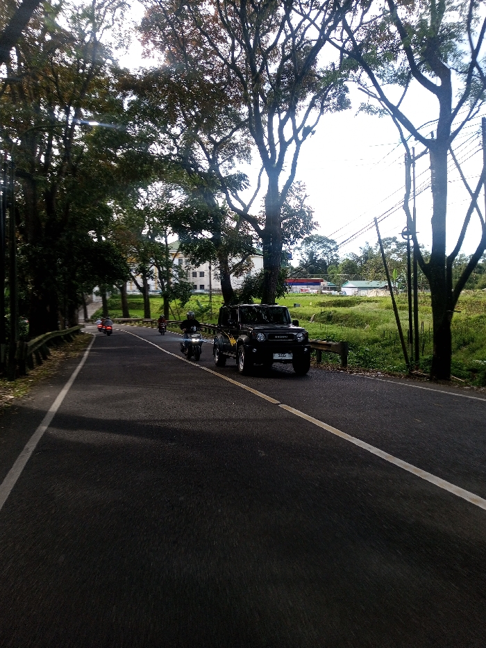 The image captures a paved road scene in Phonengam, Laos, under diffused lighting. The perspective is from ground level, looking forward along a dark asphalt road that exhibits a slight curve to the left. A solid white line marks the left edge of the road, and a solid yellow line defines the right boundary of the visible lane. On the right side of the road, a black Suzuki Jimny SUV is situated near a metal guardrail. The vehicle features a yellow graphic on its side and displays a license plate with the registration "3ZG 19". Behind the Jimny, a person wearing a helmet operates a dark-colored scooter/motorcycle, moving in the same direction. Further ahead on the road, two additional individuals, each on a scooter/motorcycle (one red, one dark), are visible, also wearing helmets and proceeding away from the camera. The environment is verdant, with numerous large trees forming a dense canopy and lining both sides of the road. In the background on the left, a multi-story white building with multiple windows is partially discernible through the foliage. To the right of the road, beyond the guardrail, lies an expanse of tall green grass and smaller plants. Further in the background on the right, low-rise structures with light-colored roofs, along with utility poles and overhead power lines, are present.