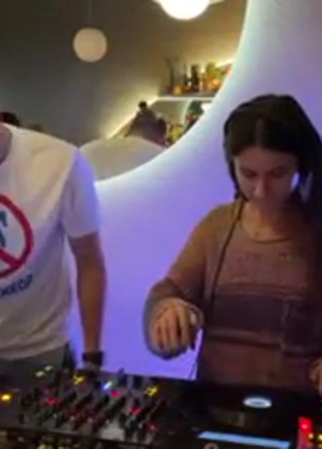 two DJs, a man and a woman, standing behind a DJ setup, operating it. The man is on the left wearing glasses and a white t-shirt with a crossed-out male gender symbol and Cyrillic text. The woman is on the right, wearing headphones and a multi-colored sweater. They're both focused on the mixing board and turntables, making adjustments. The DJ equipment includes a Pioneer mixer. Behind them is a modern, minimalist wall design with rounded shapes and a mirror. The environment suggests they are in a club or bar. There is a purple light stick next to the woman.