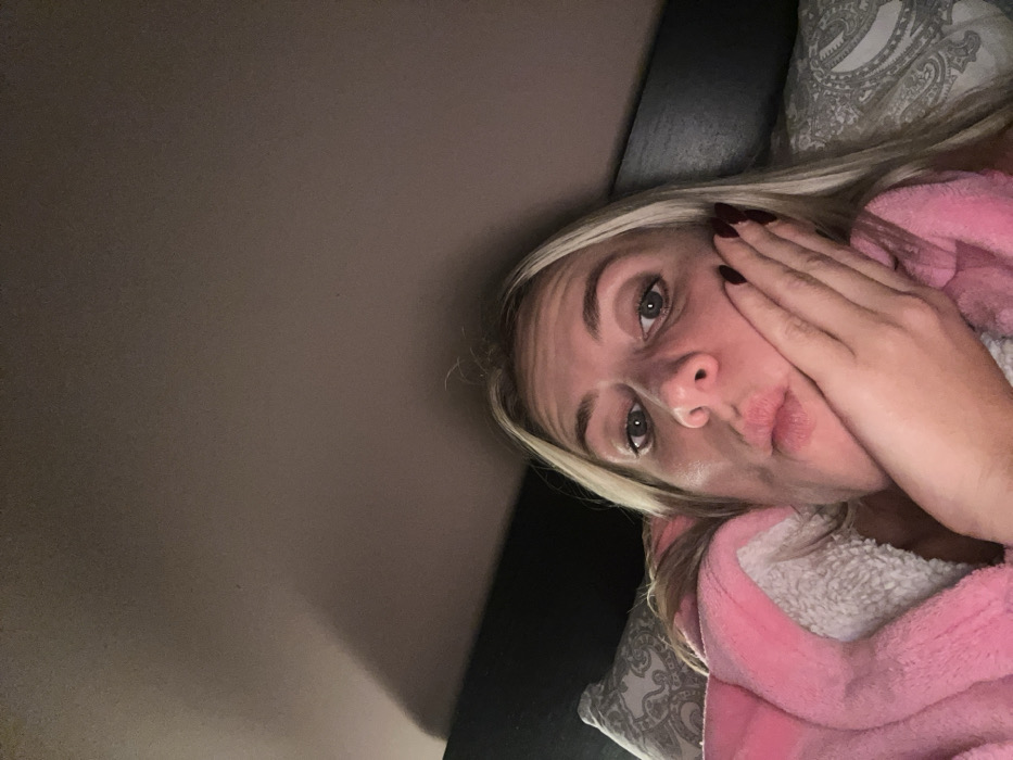 A woman with blonde hair and a pink robe is lying on a bed with a patterned pillow. She is making a kissing face with her lips puckered and her hand on her cheek. Her eyes are green and she appears to be in a dimly lit room, possibly a bedroom. A wall is visible in the background.