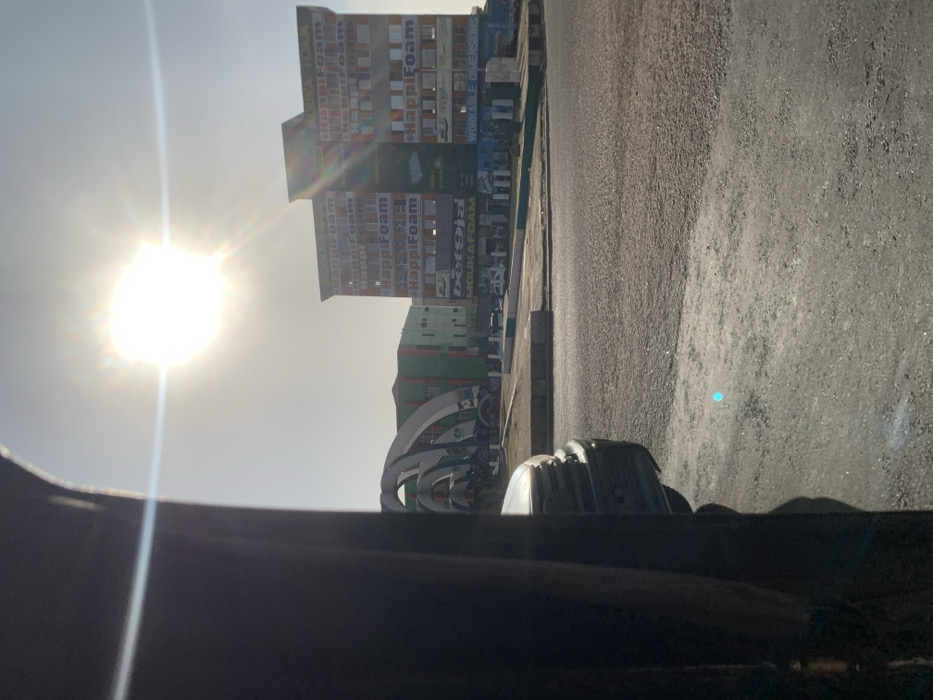 This image depicts an outdoor urban environment in the city of Sardauna, Nigeria, under intense midday sunlight, characterized by a prominent sun in the upper center-right causing significant lens flare. The immediate foreground on the left is obscured by a dark, out-of-focus vertical element, partially revealing the front bumper and grille of a light-colored vehicle. An asphalt road occupies the mid-ground, leading to a concrete median with green and white painted sections. In the background, a multi-story commercial building with a light-colored facade is heavily covered with large advertisements for "HappiFOAM" and "Moukafoam," alongside "bet9ja" and "WORKABLE DIMENSIONS" signage. To the left of this building, another structure with green and orange paneling is visible, and further left, a distinctive architectural or sculptural feature comprising multiple white and green arched elements is partially present. A few indistinct vehicles are visible in the background near the buildings. No human subjects or specific interactions are clearly identifiable.