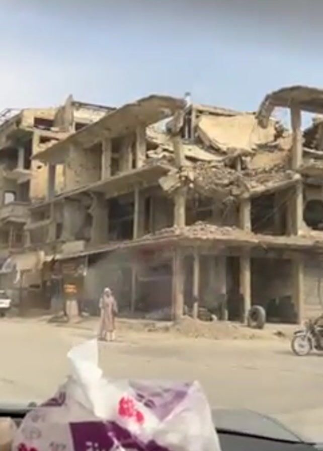 street view from inside a vehicle, with the camera pointed towards a heavily damaged building across the street. The building appears to be multi-storied, with significant structural damage, including missing walls and ceilings. There are tires stacked next to the building. Pedestrians, including a woman in traditional Middle Eastern clothing, are walking near the building. A motorcycle with two riders passes by on the street. Inside the car, a bag of what appears to be bread and a package of tissues are visible. The sky is overcast.