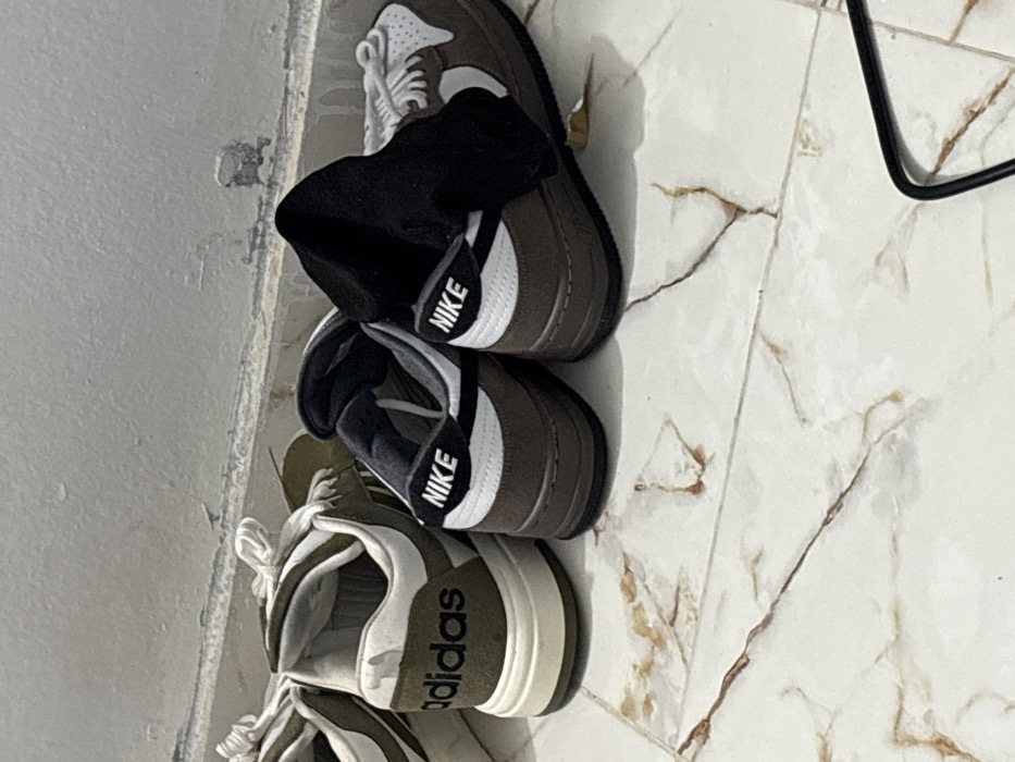pile of three shoes stacked on top of one another, positioned against a wall. The top two shoes are Nike brand, with a brown and white color scheme, and a black sock rolled into the top one. The bottom shoe is Adidas brand, displaying an olive green and white design, with laces visible. The background is a white marble tiled floor.