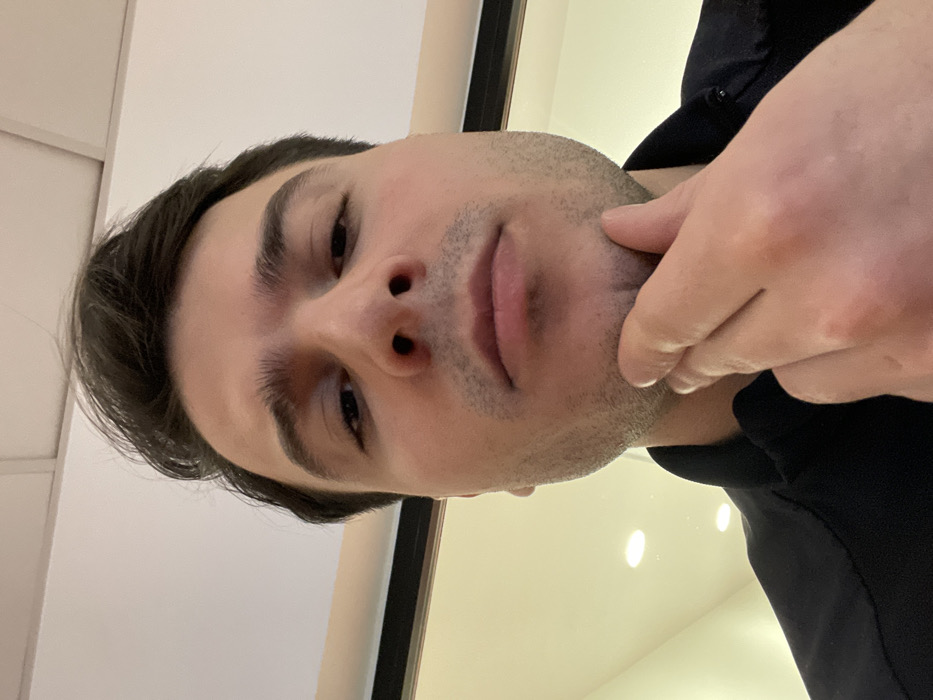 An adult male with dark hair and fair skin is depicted in a close-up, low-angle self-portrait within an indoor setting in the city of Unknown, Unknown