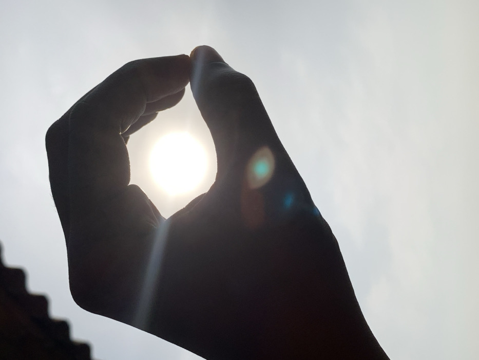 The image displays a close-up, backlit photograph depicting a human hand against a bright sky, consistent with an outdoor scene in Ikorodu, Nigeria. The hand, presented as a dark silhouette, is positioned in the center-left, with the thumb and index finger forming a closed loop. A brilliant, circular, white light source, identified as the sun, is centered within this loop, causing significant overexposure and prominent blue-green lens flares visible below it and extending diagonally. The remaining fingers of the hand are curled. The background consists of a uniformly light grey-white sky, with a dark, corrugated structural element, likely a roof or awning, visible as a silhouette along the upper-left edge of the frame. No other people or specific objects are discernible.