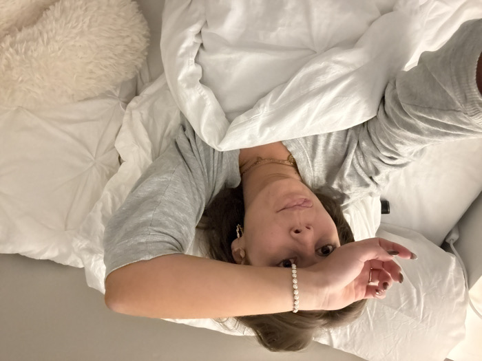 A woman lies in a bed covered with white sheets and a fluffy pillow. She wears a grey shirt and a diamond bracelet. Her arm covers part of her face. She has brown hair and fair skin. A gold necklace is visible around her neck. The photo appears to be taken from an overhead perspective, perhaps a selfie.