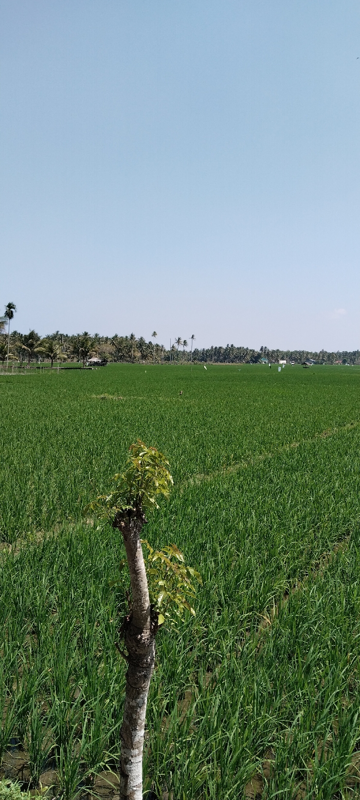 A vibrant green rice field stretches under a clear, light blue sky. In the foreground, a short tree trunk with emerging leaves stands prominently. A line of trees, including palms, borders the horizon. Scattered small structures are visible within the field. The scene conveys a sense of peaceful rural tranquility.