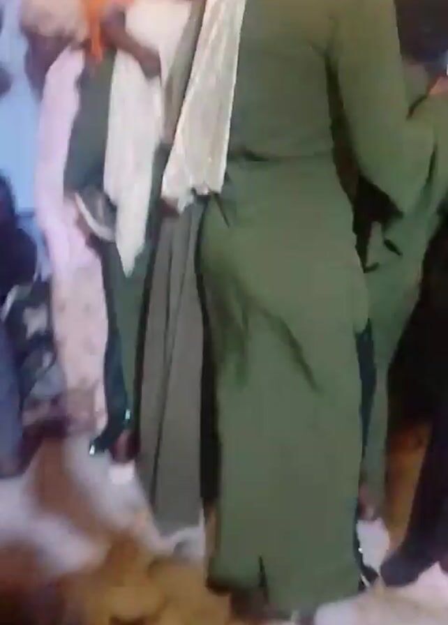 group of people, mostly women, dressed in traditional clothing, gathered indoors. Some of the women are wearing green robes. One woman is holding a child. There is a bright light source that is partly obscuring the view. A young girl in a patterned dress and head covering looks directly at the camera. Loud, sudden noises are heard at the beginning of the video, similar to fireworks or explosions. The environment appears to be a festive gathering.