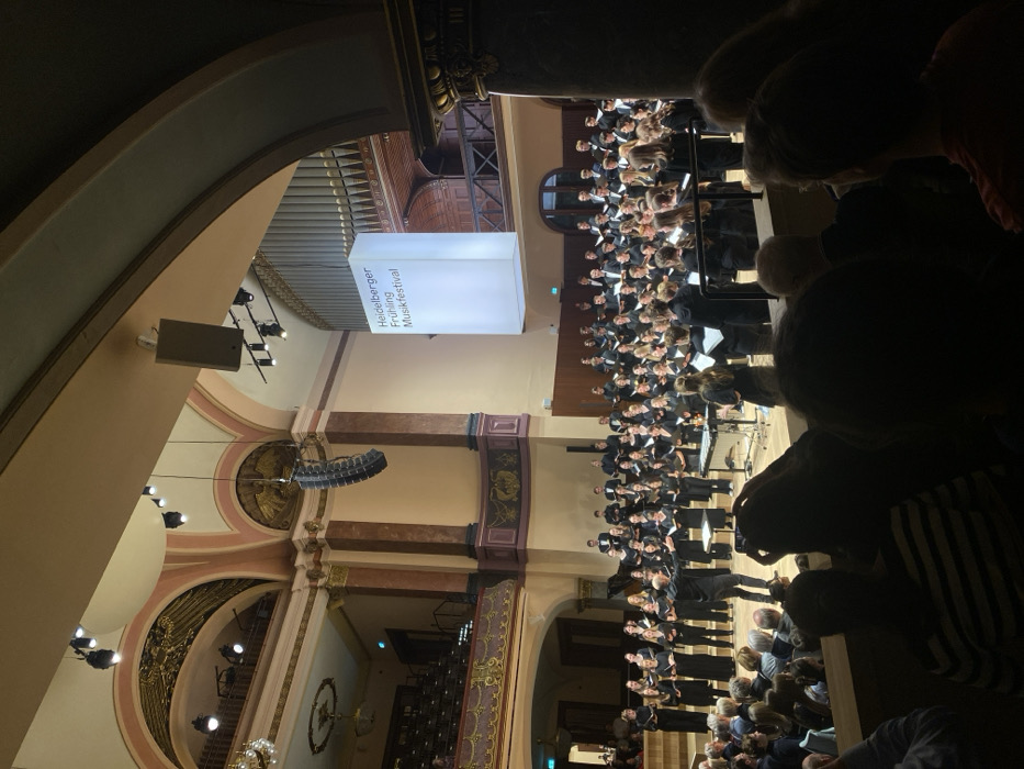 The image displays an interior view of a live musical performance occurring at the Stadthalle Heidelberg in Heidelberg, Germany, as indicated by a prominent illuminated sign displaying "Heidelberger Frühling Musikfestival