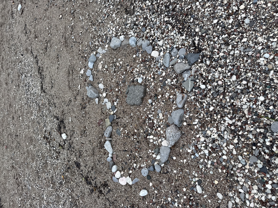 A circular formation of various-sized stones rests on a sandy beach