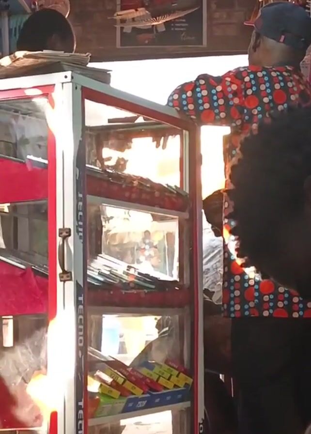 interior of a small shop, possibly in Africa. Several people are present, browsing or waiting. A man in a striped shirt is seen placing a large, translucent plastic container, filled with what appears to be dried grains or seeds, on his head. The container has a green lid. The shop has items for sale displayed in a glass case. A small, dusty electric fan is mounted on the ceiling. The lighting is bright, possibly due to sunlight filtering in.