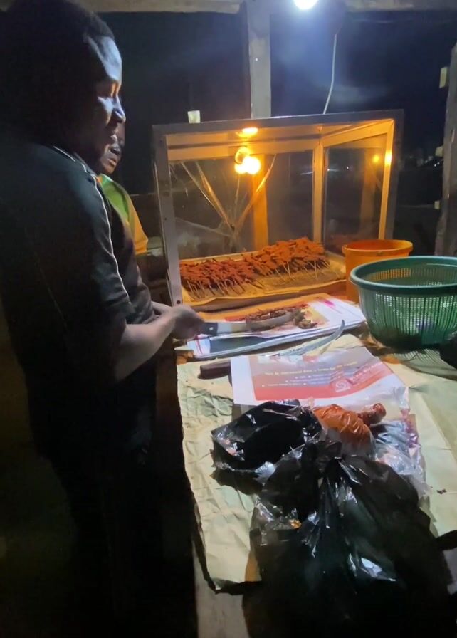 A man is seen standing at a food stall, illuminated by a bright overhead light and the warm glow of a display case filled with skewers of cooked meat