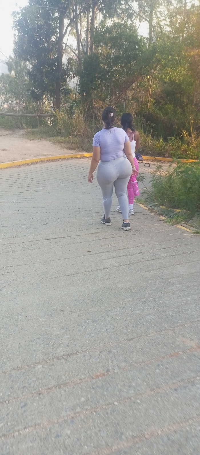 This image captures two females walking away from the camera on a paved recreational path in a natural park setting within Caracas, Venezuela