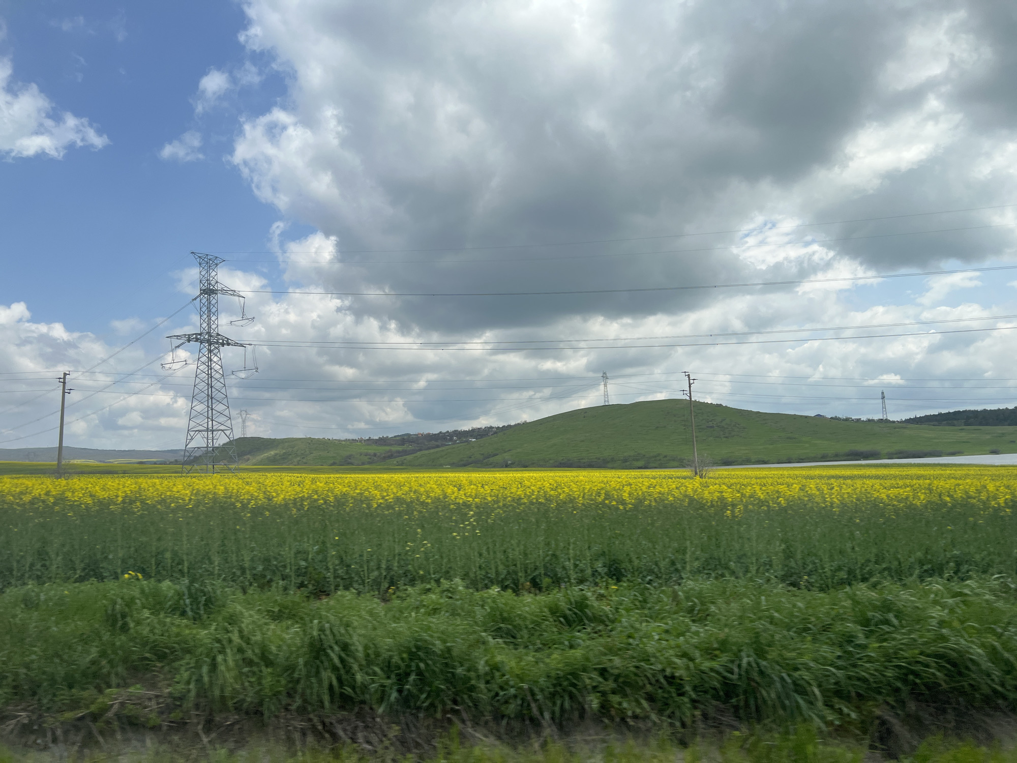 rural landscape near Bulgarovo, Bulgaria. A field of yellow rapeseed flowers dominates the midground, bordered by a patch of green grass in the foreground. In the background, rolling green hills are visible, with some structures nestled on the slopes. Power lines and transmission towers are seen stretching across the landscape. The sky is partly cloudy with a mix of blue patches and gray clouds.