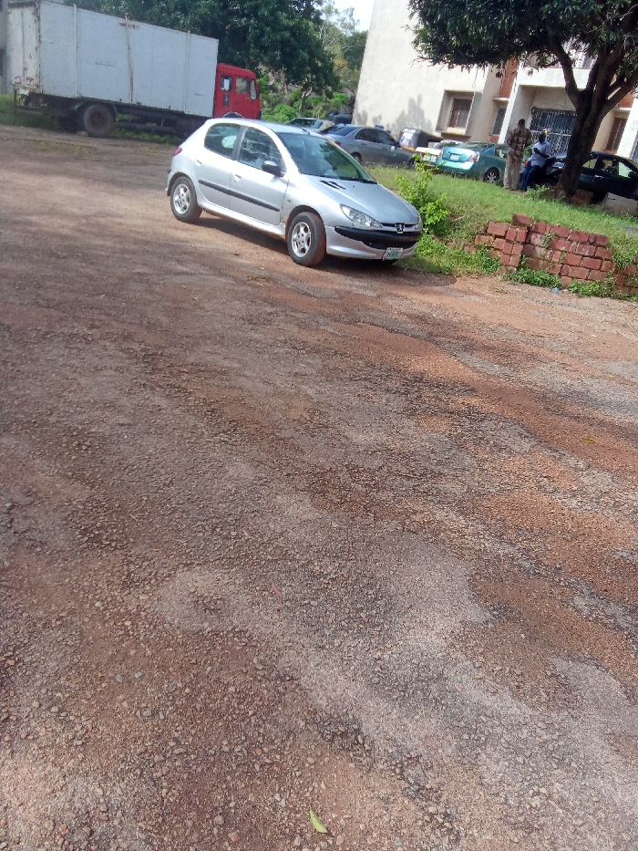 The image depicts an unpaved, reddish-brown gravel and dirt roadway or parking area in Bar Jirgi Summa, Nigeria, under bright daylight. A silver Peugeot 206 hatchback is parked facing slightly right of center on this unpaved surface. To the left, a white box truck with a red cab is partially visible, parked amidst green foliage. In the background on the right, a light-colored, multi-story building with visible windows stands under a large tree. Under the tree, several individuals are standing and appear to be conversing. Additional vehicles, including a dark sedan and a light blue/green sedan, are parked near the building and obscured by vegetation. A low, partially stacked red brick structure or wall is visible on the right side of the unpaved area, bordering a patch of grass. The ground exhibits tire tracks and uneven surfaces.