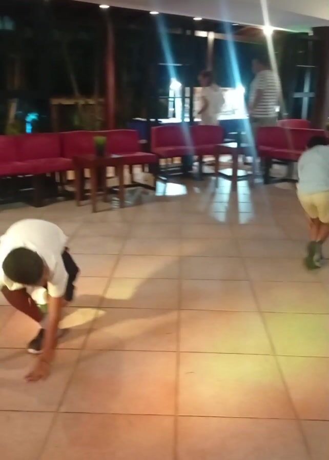 two young boys dancing on a tiled floor in an open, covered area. The boy in the foreground wears a white t-shirt, dark shorts, and sneakers. The other boy is dressed in a light blue shirt, light-colored shorts, and sneakers. They are mimicking each other's movements. The room appears to be a lounge area, with red cushioned benches and tables. There are adults walking in the background. The floor is illuminated with a pinkish light, possibly from a colored light source.