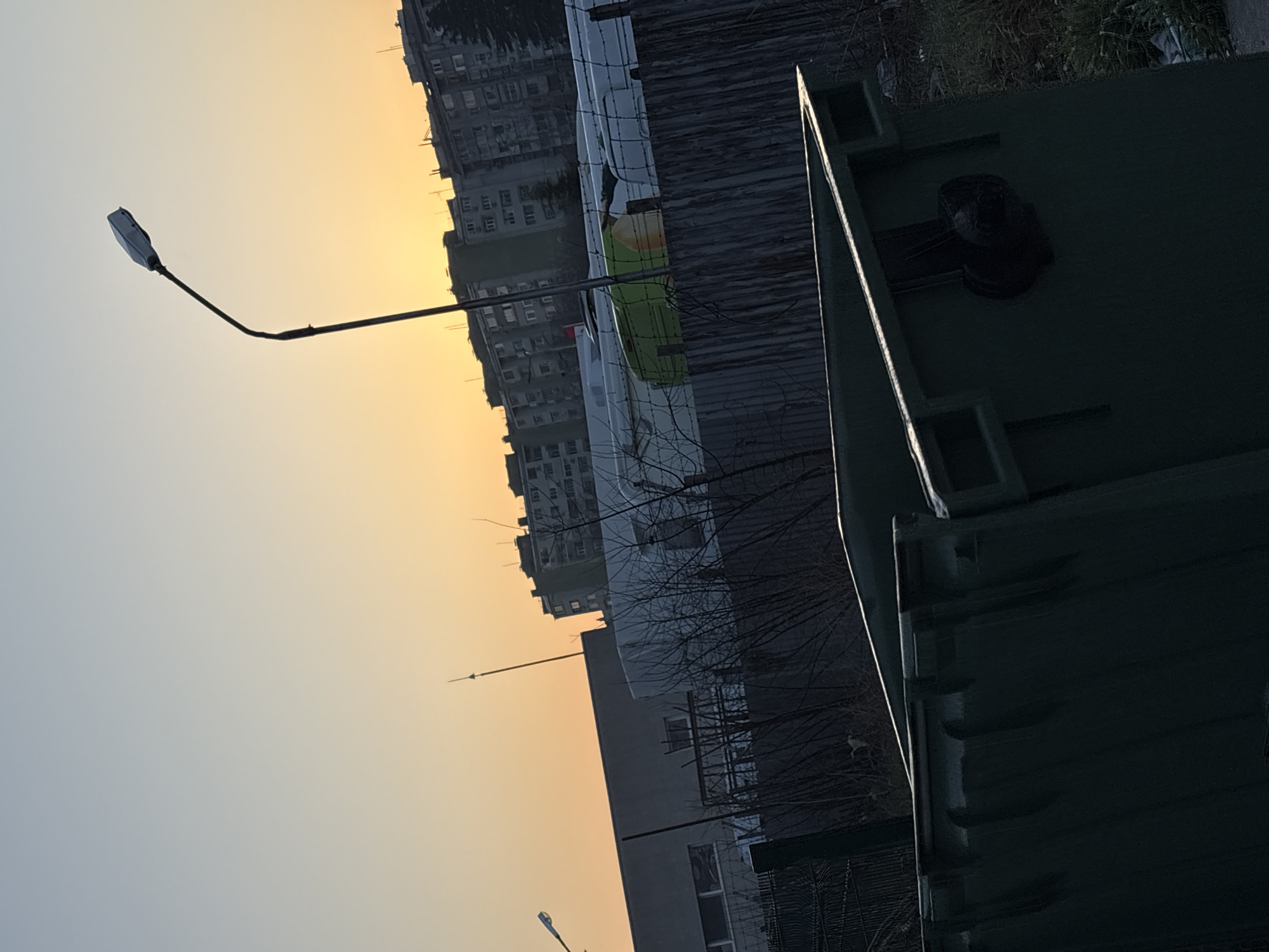 The image depicts an urban landscape at sunrise or sunset in Burgas, Bulgaria, characterized by a low sun casting an orange-yellow glow across the horizon. The foreground features a dark green municipal waste container positioned centrally, with its lid partially open. Adjacent to and behind the container, sparse, dry vegetation and scattered debris are visible. A dilapidated wooden fence, topped with barbed wire, spans the midground horizontally. Beyond this fence, several light-colored vehicles, possibly vans or trailers, are parked; one vehicle is distinctively bright green with an orange accent. Bare tree branches protrude upwards from behind the fence line. In the background, a large, grey industrial-style building with horizontal windows is visible on the left. To the right, a row of multi-story residential apartment blocks, typical of socialist-era architecture, dominates the skyline, with one building featuring a prominent green facade section. A tall, curved street light pole with a modern luminaire stands prominently in the upper mid-section, silhouetted against the bright sky, and a second street light is partially visible on the far left. No individuals or active interactions are observed.