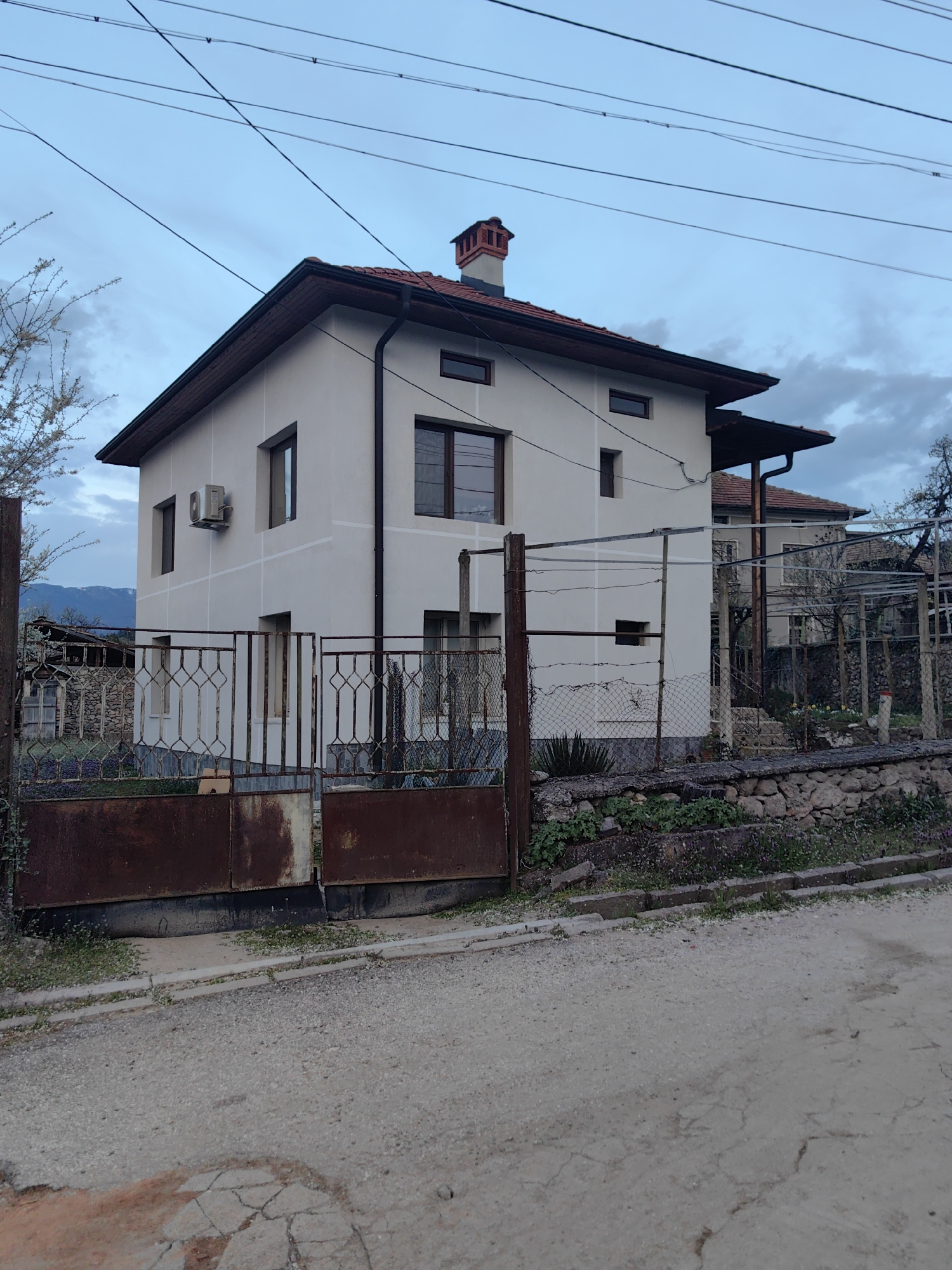 two-story, light-colored house in a residential area. The house has a red tile roof and dark brown window frames. An air conditioning unit is mounted on the exterior wall. A rusted metal gate is in front of the house, and a stone wall and chain-link fence surround the property. The street in front of the house is unpaved. Power lines run above the house. The sky is cloudy, suggesting it might be dusk or dawn. In the background, there are glimpses of other houses and what appear to be mountains. The location is likely the city of Slatina, Bulgaria, based on the prompt's information, but there are no explicit markers in the image to confirm this location.
