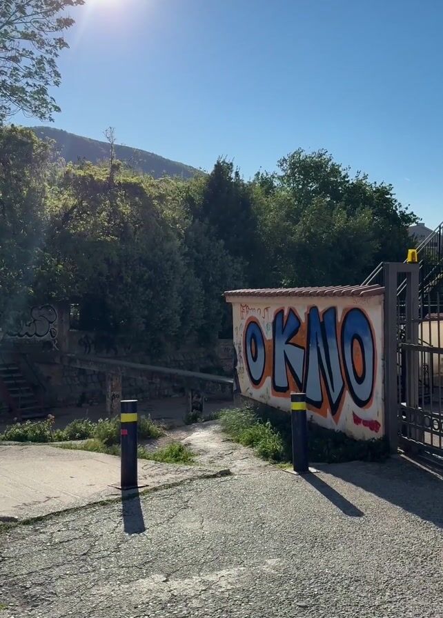 sunlit scene on a clear day. In the foreground, an asphalt road leads to a walled entrance. The wall is covered in graffiti, prominently featuring the word "OKNO" in large, blue letters with yellow outlines. Two black bollards with yellow bands flank the entrance. Beyond the wall, a set of stairs is visible, leading down towards a densely vegetated area. A metal gate is partially open to the right of the wall. The background features a hill covered in trees under a bright blue sky. The sun is shining intensely, creating a lens flare effect.