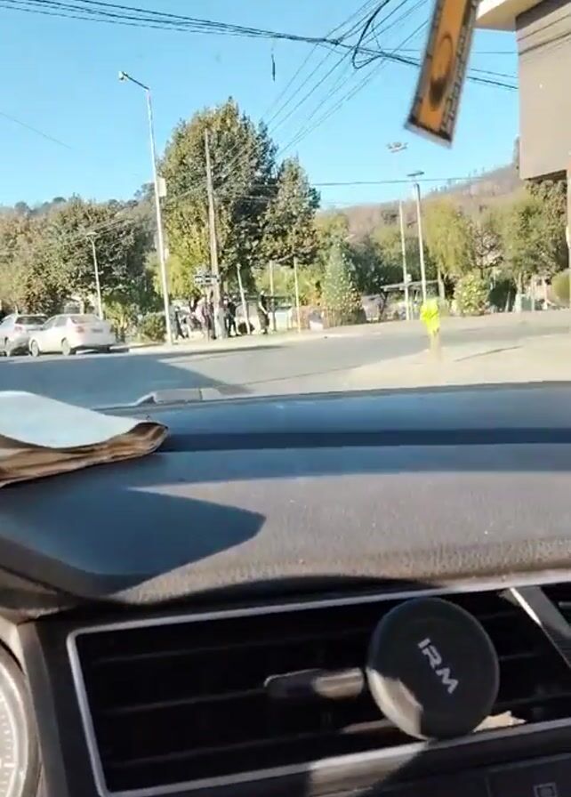 view from inside a car at a small town in Chile. The driver, presumably, is passing through the town. The view shows a town square with people walking on the sidewalk. Trees, buildings, and other cars are visible. A car air freshener dangles from the rearview mirror. The dashboard of the car is visible as well.