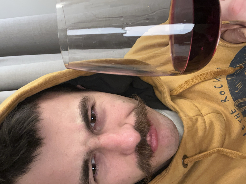 A close-up, front-facing image depicts a male subject with short, dark hair and a prominent, thick, dark brown handlebar mustache. His eyes are narrowed, eyebrows slightly furrowed, and mouth slightly pursed, directed towards the viewer. He wears a mustard yellow hooded sweatshirt with dark drawstrings featuring metal eyelets. Partial text and a dark graphic design are visible on the front of the sweatshirt, including the words "...THE ROCKS...". A clear glass, appearing to be a wine glass, containing dark red liquid filled approximately one-third to half full, is held in the lower right foreground. The background consists of light grey or off-white vertical curtains on the right side. The scene is indoors. Based on the visual evidence, the specific location in the city of Milan, Italy, cannot be determined.