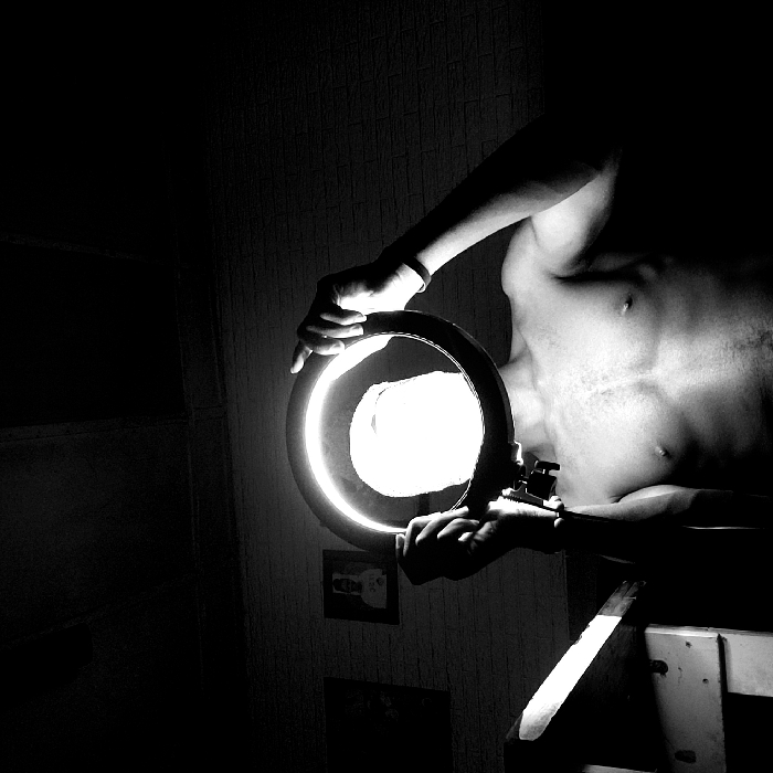 A stark black and white photograph features a shirtless person holding a ring light. The intense glare from the light source obscures details within its circle. The person's torso, exhibiting muscular definition, is prominently displayed. The scene is starkly contrasted, with deep shadows enveloping the background and highlighting the illuminated areas. A workbench is partially visible beneath the person's arms. The image exudes a sense of artistic intensity and introspection.