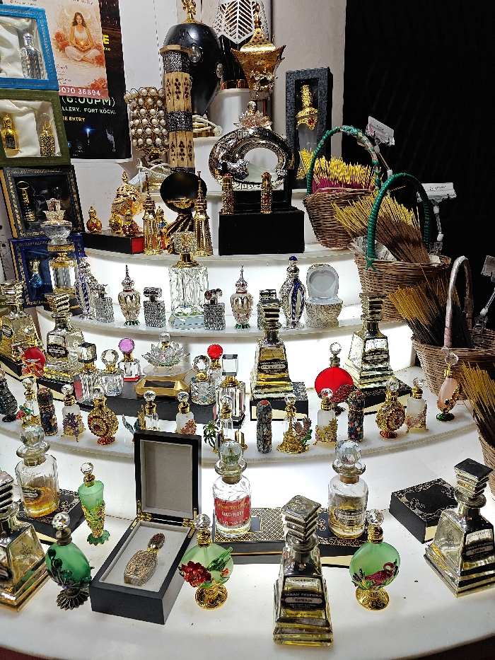 The image captures a meticulously arranged, multi-tiered retail display of perfumery items within a commercial establishment in Fort Kochi, Kochi, India