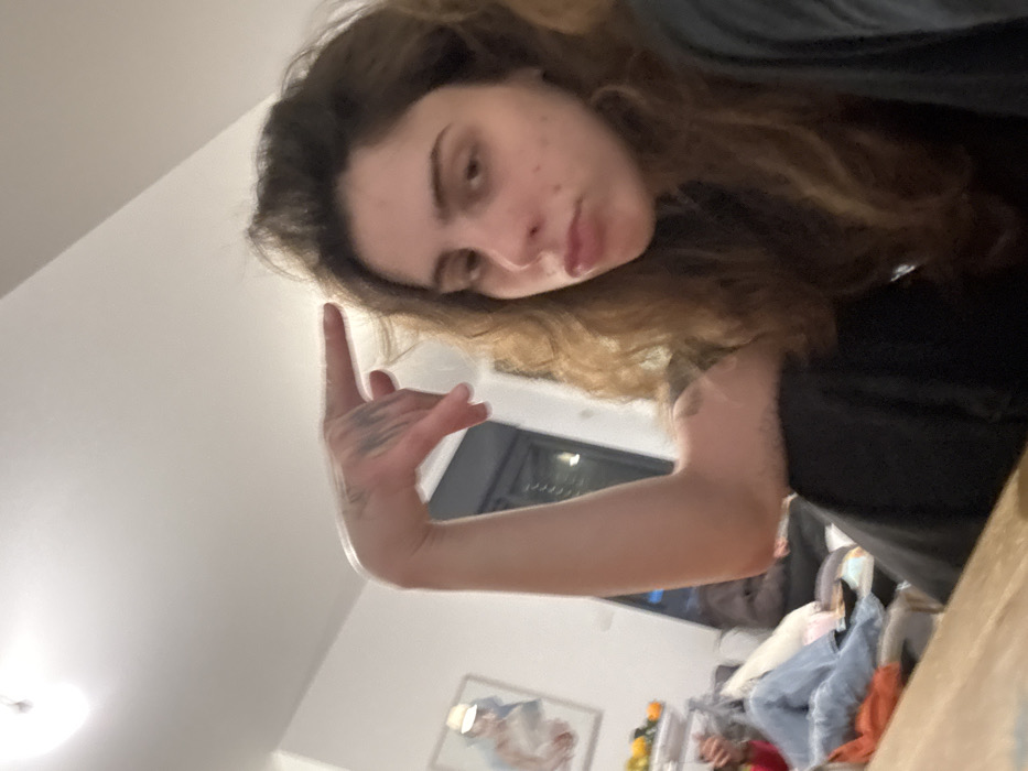 The image displays an indoor residential setting located in Givatayim, Israel. A young female individual with long, wavy brown hair, wearing a dark shirt, is centrally positioned in the foreground, facing the camera. She exhibits a mild pout. Her right arm is raised, with her hand, adorned with tattoos, forming a "finger gun" gesture pointed at her temple. In the background, blurred figures of at least two other individuals are visible, seated on light-colored upholstered furniture. One person's legs, clad in blue jeans, are discernible. The room features white walls, a framed artwork depicting a figure is mounted on the left, with small, colorful objects arranged on a surface below it. A dark-framed window or door is visible in the distant background. Illumination is provided by an overhead light source in the upper left. A wooden surface occupies the lower left corner of the frame.