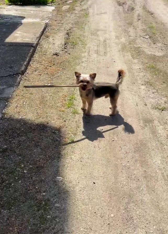 - "A small, tan and black dog carries a long stick in its mouth down a dirt path" by FM-3q1Os1, licensed under CC BY 4.0
