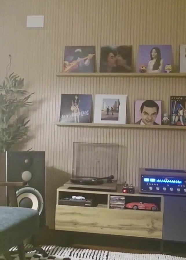living room setup featuring a sound system and decorative elements. The focus is on a wooden cabinet housing a turntable and a blue-lit amplifier. Above the cabinet are two shelves displaying various vinyl records, pictures, and figurines. A large speaker stands to the left of the cabinet, alongside a potted plant and a blue cushioned chair. The wall behind the furniture is textured with vertical stripes. A black and white checkered rug covers the floor in front of the setup.